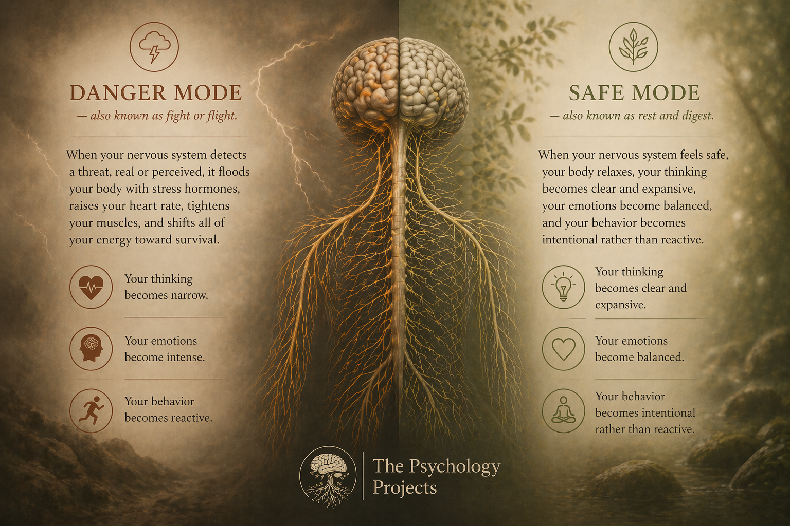 Here is what makes this so important for psychology: most people are walking around stuck in danger mode without knowing it. Not because there is a lion chasing them, but because their nervous system was shaped by past experiences to treat everyday life as a threat.